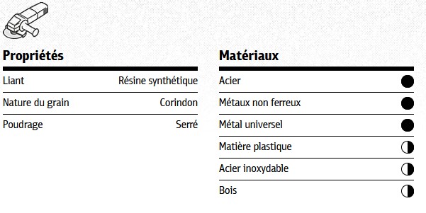 Ce disque abrasif se compose d'un support à base de matière composite possédant plusieurs couches de papier épais avec un grain en poudrage dense en corindon. La liaison des grains sur le support est assurée par une colle à base de résine synthétique.