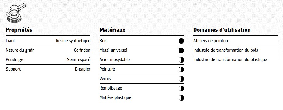 Le disque abrasif est adapté à une utilisation sur des machines à guidage manuel et réalise dans tous les cas un aspect meulé homogène. Un encrassement précoce lors d'usinage de bois est empêché par la dispersion semi-ouverte. Dans le cadre de l'usinage de métal, l'adhérence élevée des grains permise par un liant à base de résine synthétique du grain sur le support s'avère à son tour un véritable atout. Afin d'être utilisable pour un aussi grand nombre de missions de meulage que possible, le disque abrasif PS 22 K est disponible en nombreuses granulométries, ainsi que formes de découpe et de perforation. Dans ce cadre, les formes de perforation sont adaptées aux trous d'aspiration des plateaux-supports courants.