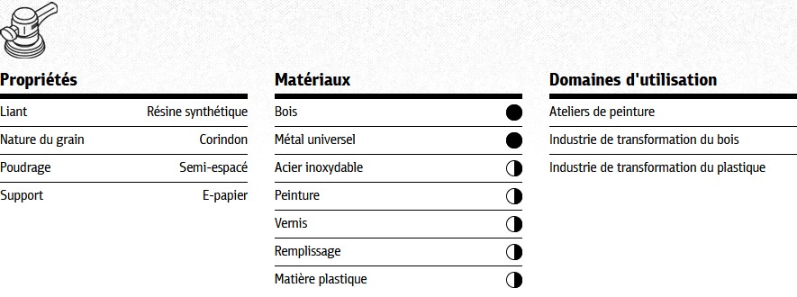 Le disque abrasif est adapté à une utilisation sur des machines à guidage manuel et réalise dans tous les cas un aspect meulé homogène. Un encrassement précoce lors d'usinage de bois est empêché par la dispersion semi-ouverte. Dans le cadre de l'usinage de métal, l'adhérence élevée des grains permise par un liant à base de résine synthétique du grain sur le support s'avère à son tour un véritable atout. Afin d'être utilisable pour un aussi grand nombre de missions de meulage que possible, le disque abrasif PS 22 K est disponible en nombreuses granulométries, ainsi que formes de découpe et de perforation. Dans ce cadre, les formes de perforation sont adaptées aux trous d'aspiration des plateaux-supports courants.