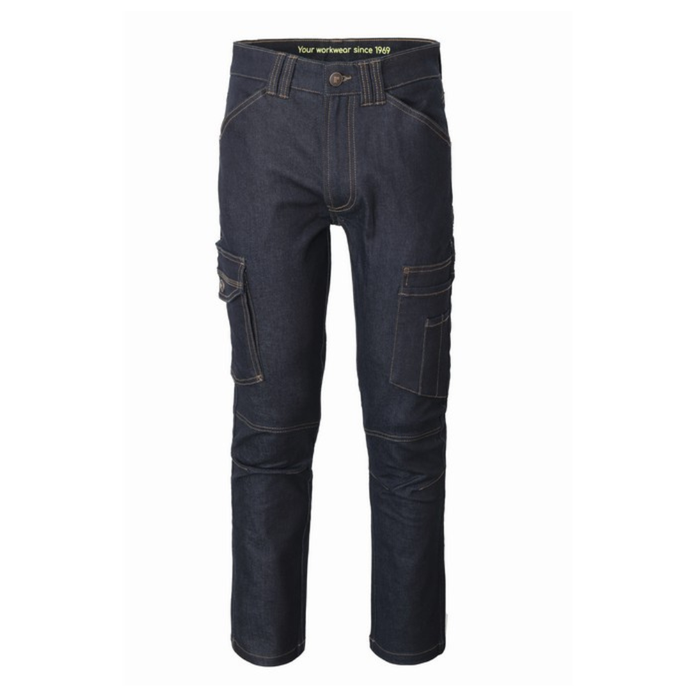 Jean de travail multipoches en denim stretch, fermeture à rabat zippée et bouton en métal avec finition effet cuivre, double passants à la taille.