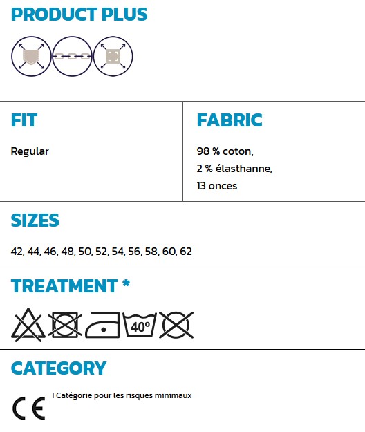 Jean de travail 5 poches en denim stretch avec traitement stone washed, fermeture à rabat avec fermeture Éclair et bouton en métal avec finition effet cuivre, passants à la taille, bande en coton de couleur fluo insérée à la taille.