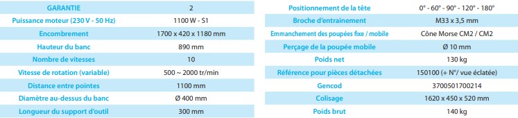 • La machine est livrée avec le piètement, l’ensemble du support d’outil, 1 plateau de 150 mm, 1 pointe à griffes, 1 contre-pointe tournante, 1 chasse pièce, clés et notice d’utilisation.